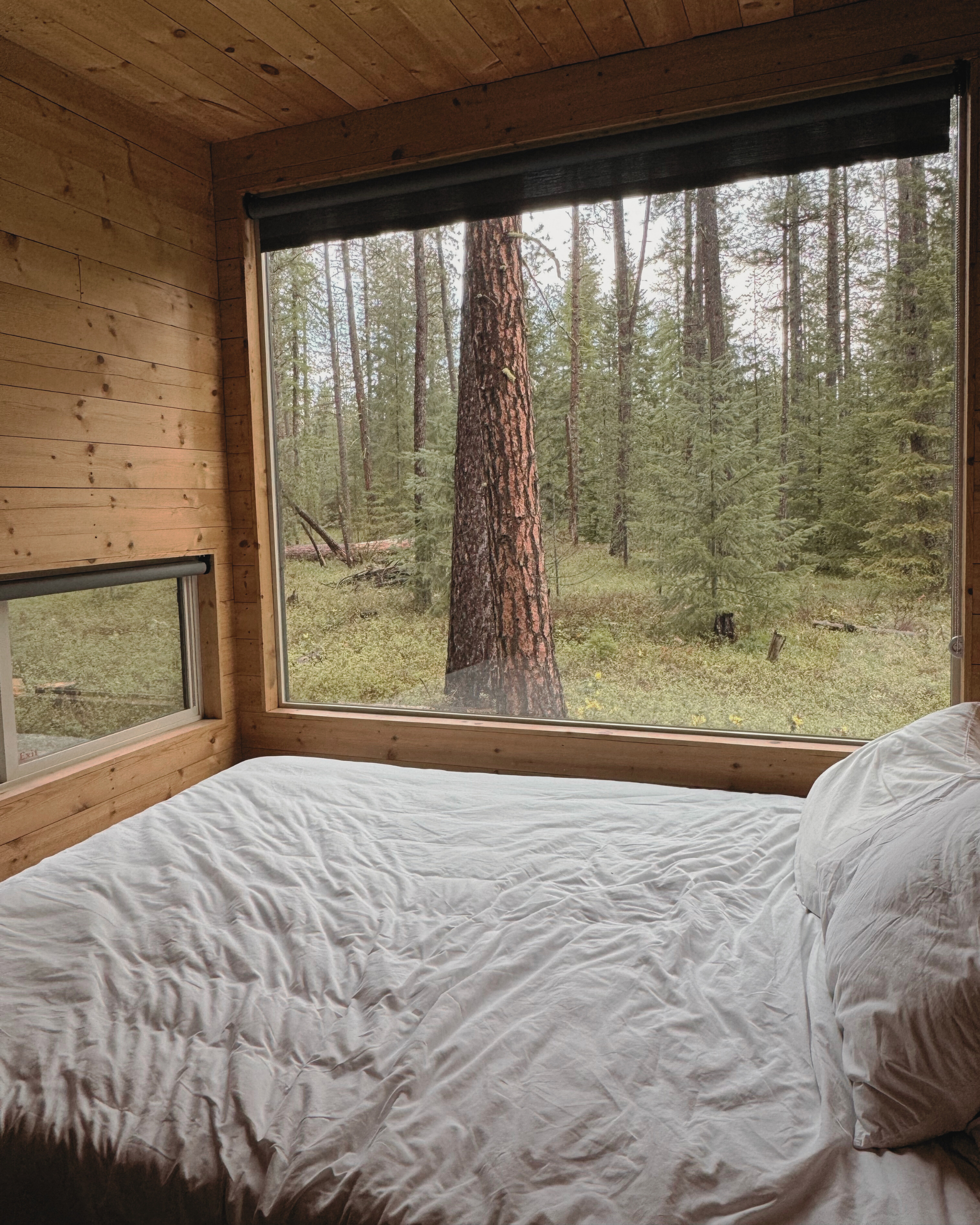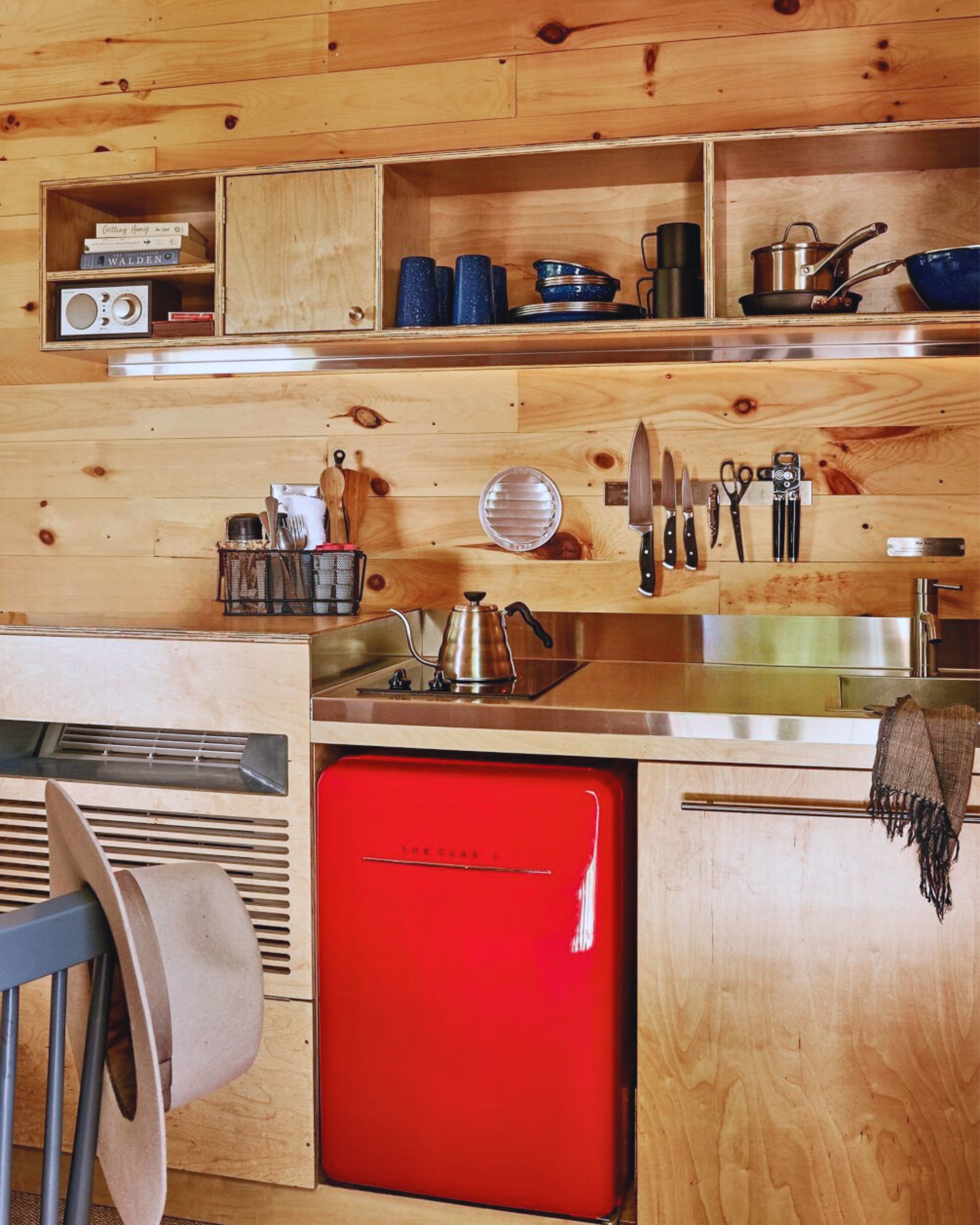 Planlösningen består av ett öppet rum med plankgolv, där du stiger in och möts av det lilla platsbyggda köket som även har en inbyggd luftvärmepump och till vänster boytan med platsbyggd sängplats där det bland annat finns ett stort treglas fönster som fyller kortsidan med ljus för en fantastisk utsikt. Rummet lyses upp med spotlights och har levande väggar i obehandlad råspont.